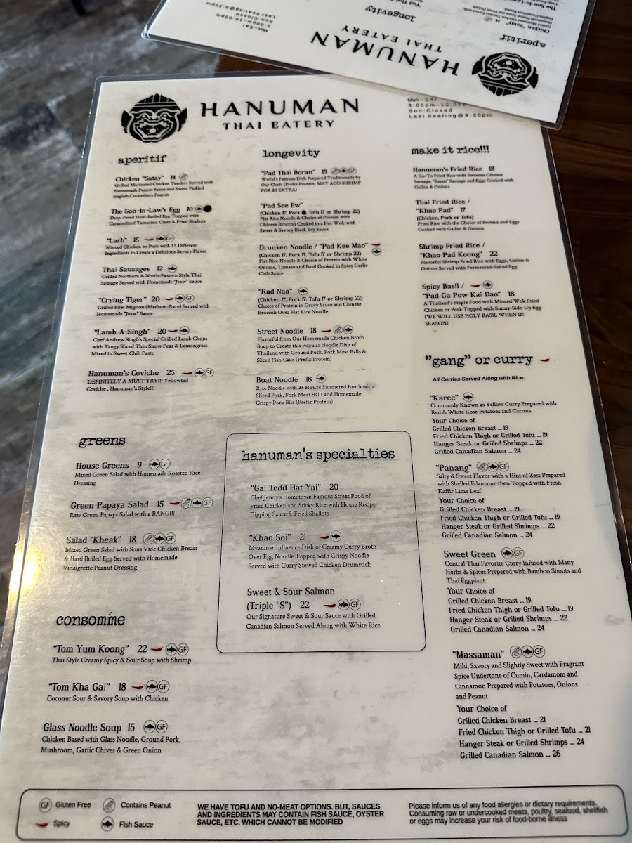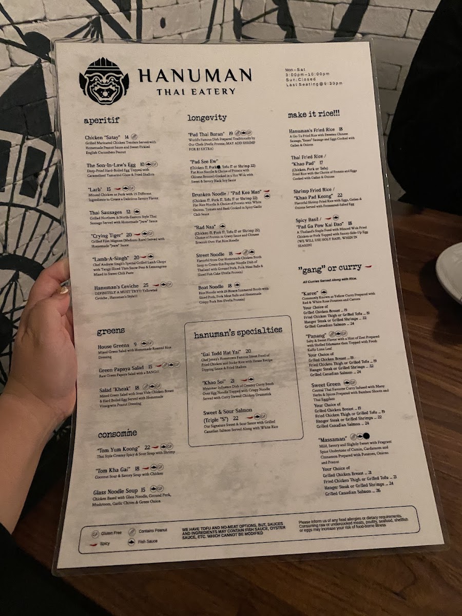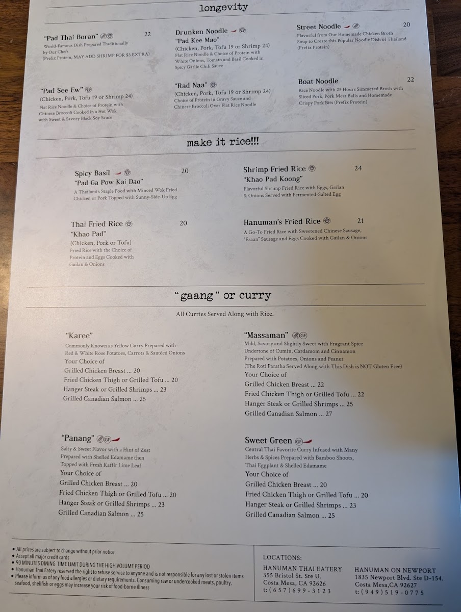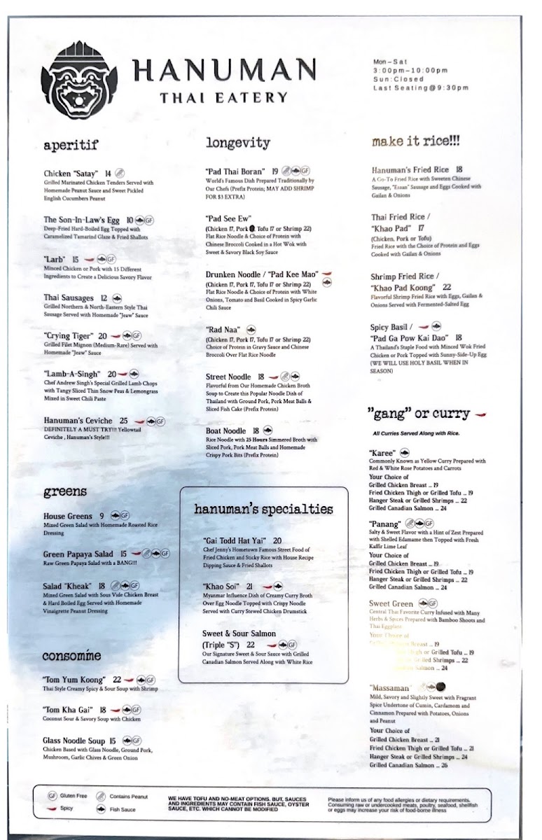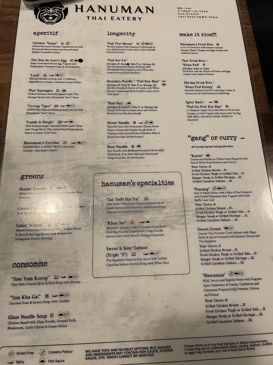 Hanuman Thai Eatery offers a diverse and vibrant menu, perfect for those seeking an authentic Thai dining experience. The "Make It Rice" section features comforting options like Hanuman's Fried Rice and Thai Fried Rice "Khao Pad", with the addition of Shrimp Fried Rice / Khao Pad Koong for seafood lovers. For those craving something spicier, Spicy Basil / Pad Ga Pow Kai Dao delivers a bold flavor. The greens section includes refreshing options such as Salad Kheak and the tangy Green Papaya Salad, offering a nice balance to the rich dishes. When it comes to soups, Tom Yum Koong and Tom Kha Gai provide the perfect balance of heat and creaminess, while Glass Noodle Soup is a lighter alternative. The curry selection includes favorites like Sweet Green, Karee, and Massaman Panang, each packed with aromatic spices. If you're looking for an appetizer, the Hanuman's Ceviche and Crying Tiger are a great choice, alongside LarbChicken Satay for a satisfying start to your meal. The restaurant also highlights unique specialties such as Gai Todd Hat Yai and the flavorful Sweet & Sour Salmon (Triple "S"), while Khao Soi is a standout for those craving a noodle dish. For sides, White Rice, Roti, and Sticky Rice complement the main dishes, while the Longevity section features hearty options like Pad See Ew and Pad Thai Boran. Don’t forget to pair your meal with a refreshing drink, whether it's a Fanta or Coke, rounding out a truly flavorful experience at Hanuman Thai Eatery.