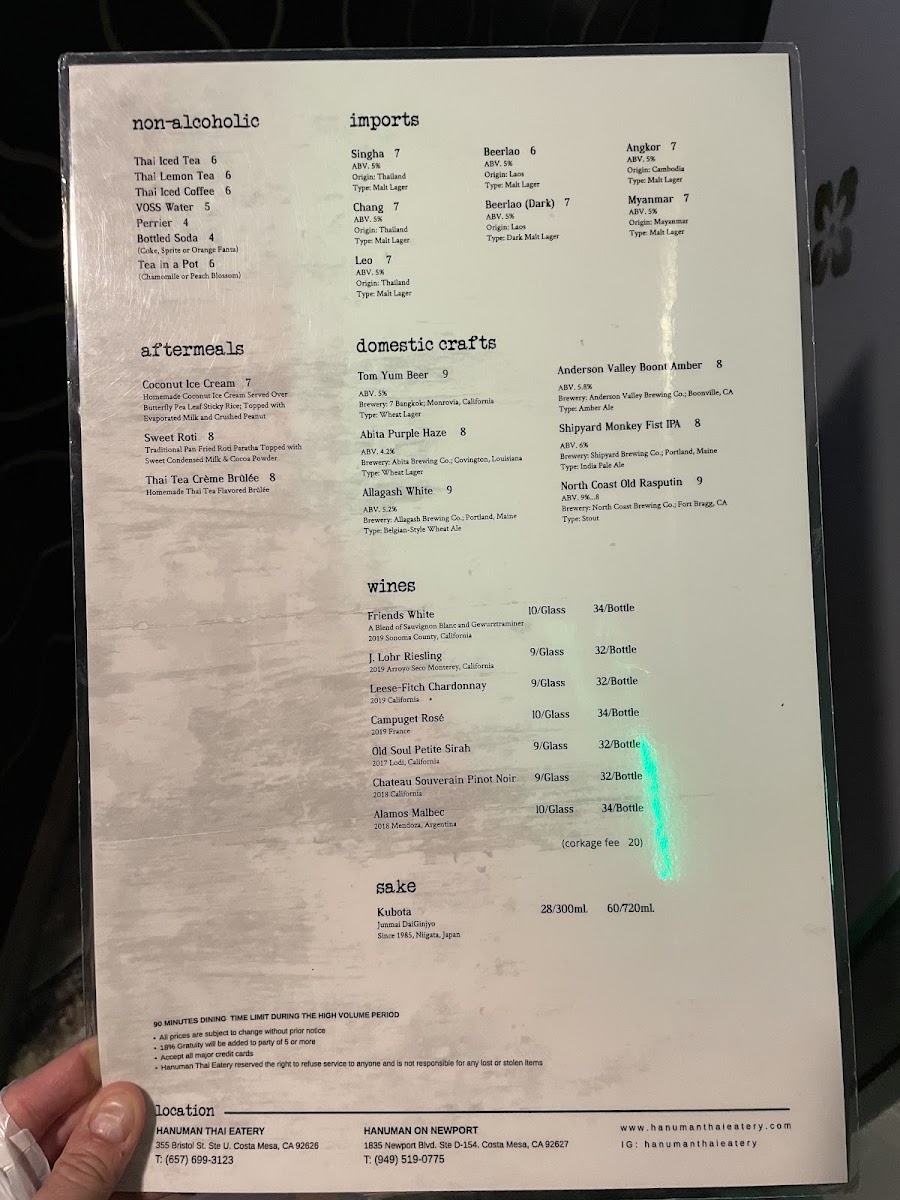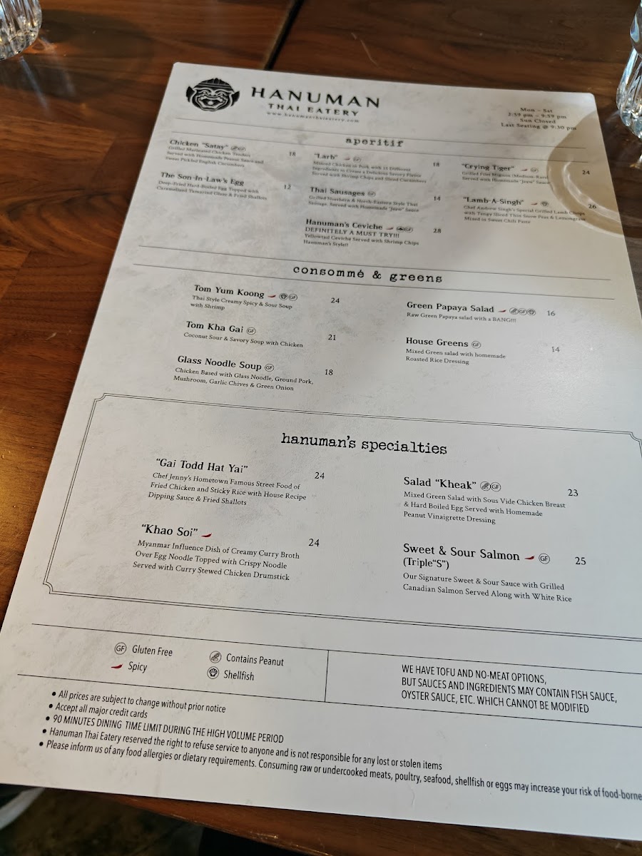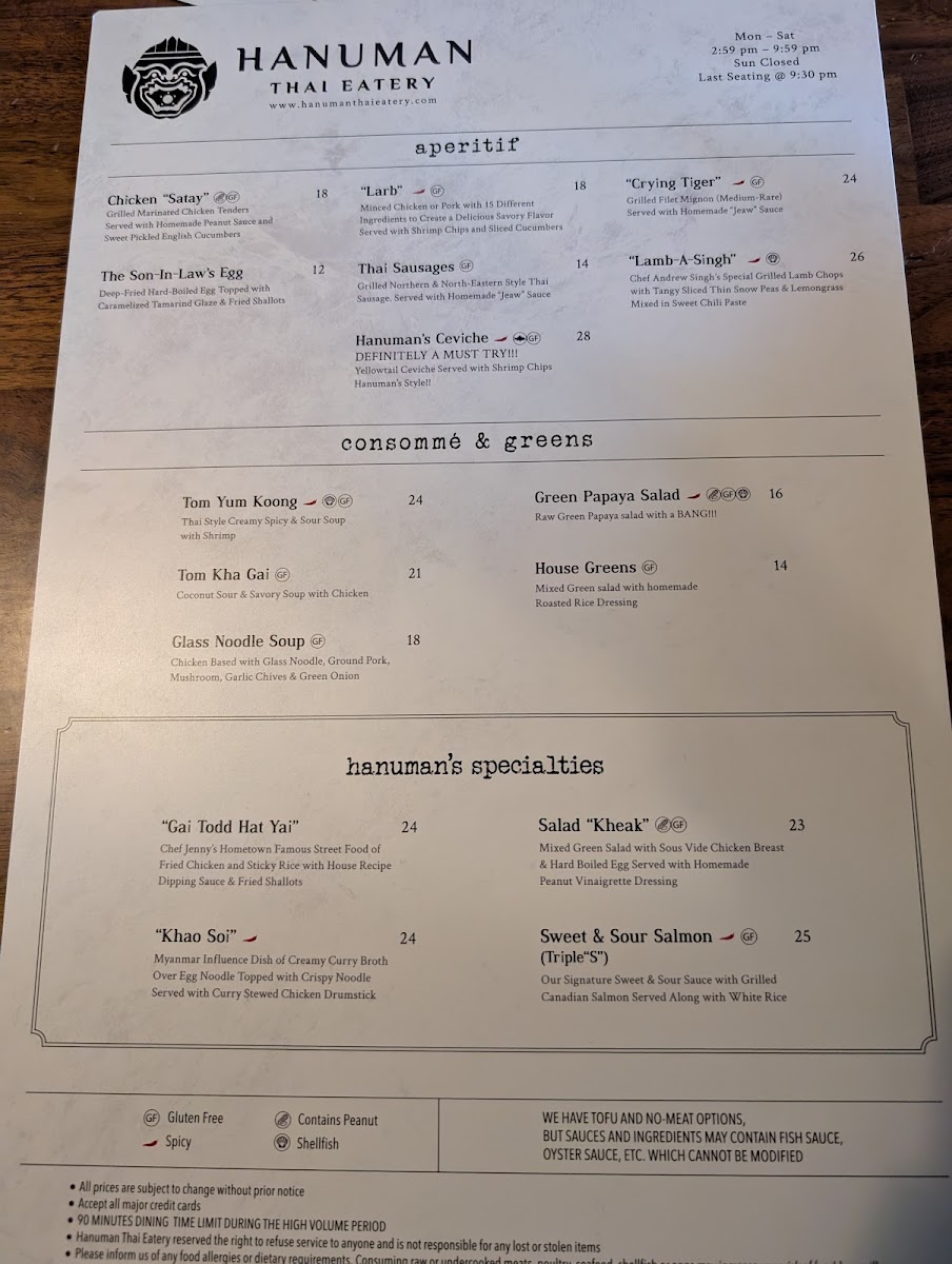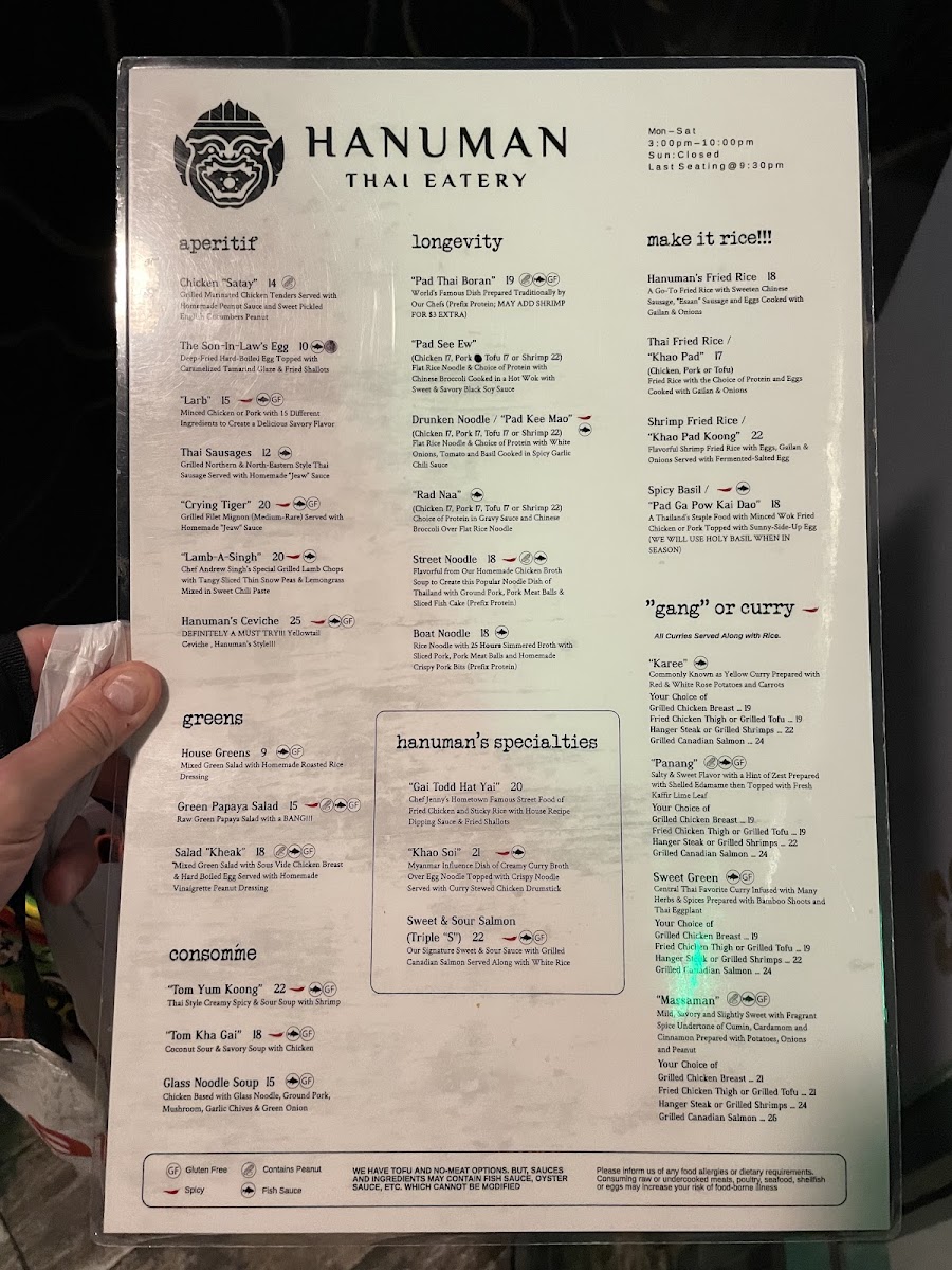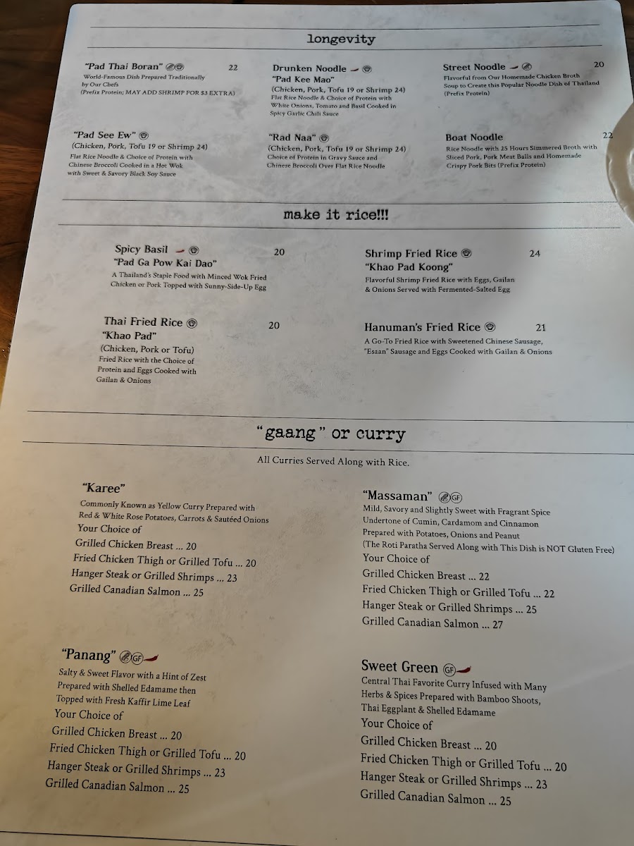 Hanuman Thai Eatery offers a diverse and vibrant menu, perfect for those seeking an authentic Thai dining experience. The "Make It Rice" section features comforting options like Hanuman's Fried Rice and Thai Fried Rice "Khao Pad", with the addition of Shrimp Fried Rice / Khao Pad Koong for seafood lovers. For those craving something spicier, Spicy Basil / Pad Ga Pow Kai Dao delivers a bold flavor. The greens section includes refreshing options such as Salad Kheak and the tangy Green Papaya Salad, offering a nice balance to the rich dishes. When it comes to soups, Tom Yum Koong and Tom Kha Gai provide the perfect balance of heat and creaminess, while Glass Noodle Soup is a lighter alternative. The curry selection includes favorites like Sweet Green, Karee, and Massaman Panang, each packed with aromatic spices. If you're looking for an appetizer, the Hanuman's Ceviche and Crying Tiger are a great choice, alongside LarbChicken Satay for a satisfying start to your meal. The restaurant also highlights unique specialties such as Gai Todd Hat Yai and the flavorful Sweet & Sour Salmon (Triple "S"), while Khao Soi is a standout for those craving a noodle dish. For sides, White Rice, Roti, and Sticky Rice complement the main dishes, while the Longevity section features hearty options like Pad See Ew and Pad Thai Boran. Don’t forget to pair your meal with a refreshing drink, whether it's a Fanta or Coke, rounding out a truly flavorful experience at Hanuman Thai Eatery.
